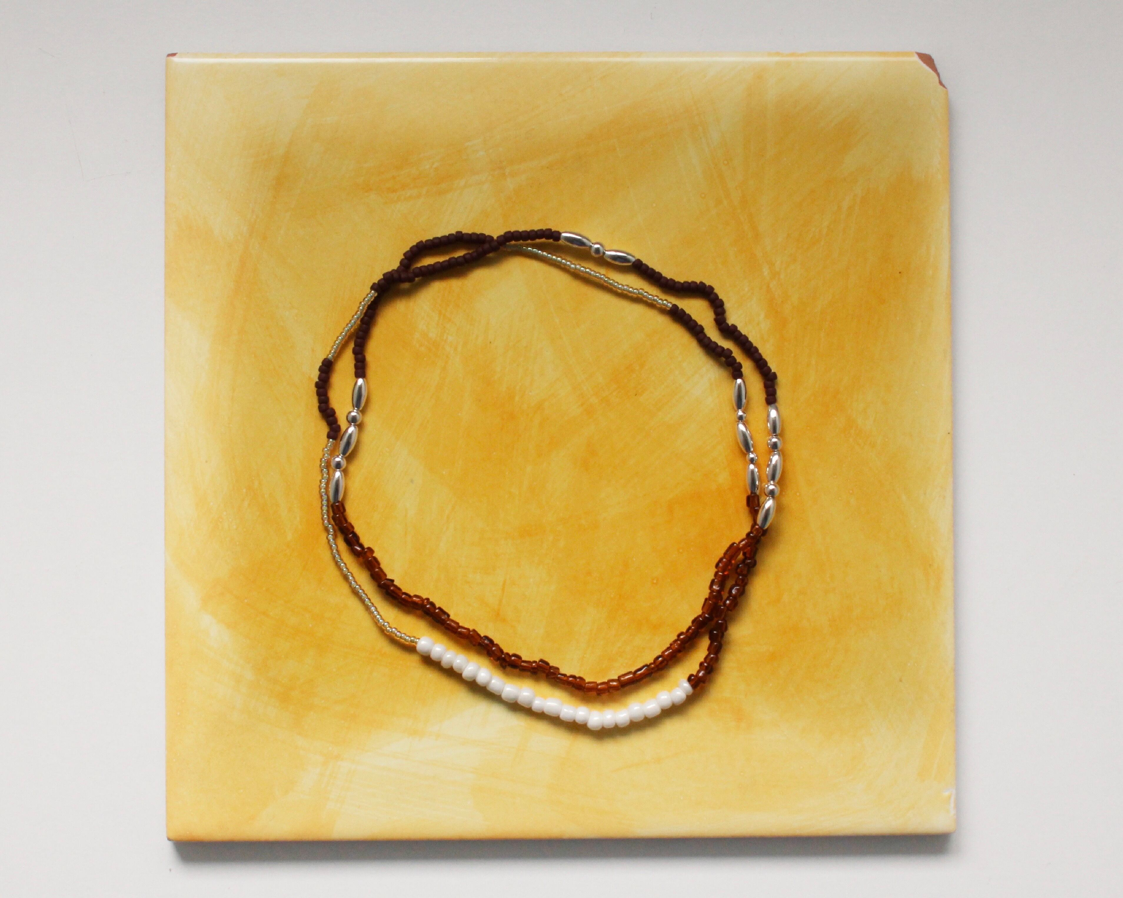 ゴムで伸縮するので、そのままシンプルにつけても二重にしても、ok。三重にするとブレスレットにもなる3wayとなっております。